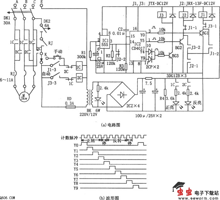 脉冲发生器是由IC1(555)和R2、R1、C1等组成的多谐振荡器,其振荡周期为T≈0.693(R1 R2)C1。计数器IC2采用十进制计数/脉冲分配器CD4017,其以IC1的输出脉冲作为时钟信号,在Y0~Y9端分别连续循环输出周期与计数脉冲周期相同的高电平,输出的Y0、Y4、Y5、Y9依次对BG1、BG2、BG3进行开关控制,启动继电器J1、J2、J3,从而控制接触器1C,2C接通三相交流电机电源,按洗衣机时序完成洗涤功能。