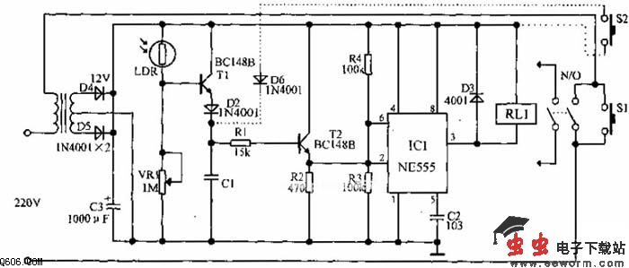 盒式放音机的自动断电电路如下图所示,有声音出现时,VU表的LED发光,光敏电阻LDR收到LED发出的光后,送出高电位脉冲到T1,T1对电容C1进行充电。电容的缓慢放电过程可提供一种延时功能,因此C1的值不同,延时持续时间也不同。电容的充放电过程形成了一个指数信号,该指数信号结555(斯密特触发器)后,被转换成完成断电功能的数字信号。按下S1电路得电工作,放音机也工作。