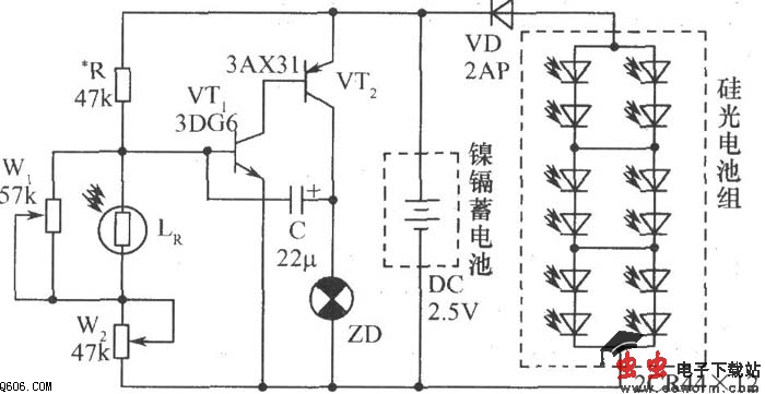 元器件选择:太阳能电池可选用2CR或2DR两种类型的硅光电池。LR可选用国产625-A型硫化镉光敏电阻,该光敏电阻在有光照时电阻值小于50kΩ,无光照时电阻值大于50MΩ。二极管VD是防止在无光线或光线很弱时(太阳能电池的电压低于蓄电池电压),蓄电池电流倒流到太阳能电池。一般VD的最大工作电流要大于太阳能电池组的最大输出电流,反向耐压要高于蓄电池电压。如用3AX31或3AX81低频管的c、b极来代替,则很容易满足要求。R在调节中决定,一般选用47kΩ左右的小型(1/8)W固定电阻。ZD为2.5V、0.3A的小型白炽灯。其他元件如图所示。
