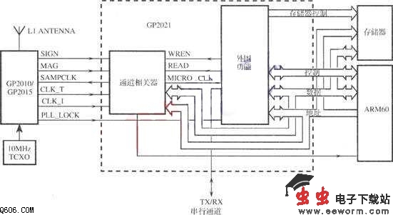 GP2021是一个12信道的C/A码基带相关器,在NAVSTAR GPS卫星导航接收机中应用。可以与GP2015和GP2010 C/A码射频下变频器组合使用。GP2021可以与大多数的16 bit和32 bit微处理器组合使用,尤其适合Motorola和Intel的微处理器。另外,片上支持ARM60 32 bit RISC微处理器。当使用ARM60 32 bit RISC微处理器时,片上的存储器支持所有的GPS接收机功能。在不需要12个通道工作时,GP2021允许12个通道中的任一个不工作,以降低功耗和减少微处理器的负载。在备用电池模式,GP2021允许所有的功能不使能,仅32.768kHz振荡器和实时时钟(Real Time Clock,RTC)维持工作。GP2021具有12个独立的相关器信道,双UART和RTC,电源电压5V,功耗小于150mW,备用电池电压 2.2V。采用80L MQFP封装,封装尺寸14mm×14mm×2.0mm,适合GPS导航接收机、GPS测量接收机、GPS时间传递接收机等应用。典型GPS接收机电路如图所示,电路由GP2010或者GP2015射频前端、GP2021相关器和ARM60 32 bit RISC微处理器组成。因为所有的卫星使用相同的频率,即Ll(1575.42MHz),因此可以使用一个射频前端。为了达到更好的天空覆盖效果,它可以使用不止一个的天线,因此需要使用各自的射频前端。在射频部分,GP2010或者GP2015射频前端为数字基带处理完成L1信号的下变频。获得的信号在 GP2021中与内部产生的卫星代码相关。每一个通道有自己单独的代码,可以同时对12个不同卫星信号进行截获和跟踪。相关的结果形成累积数据传输到微处理器进行处理,得到导航信息。