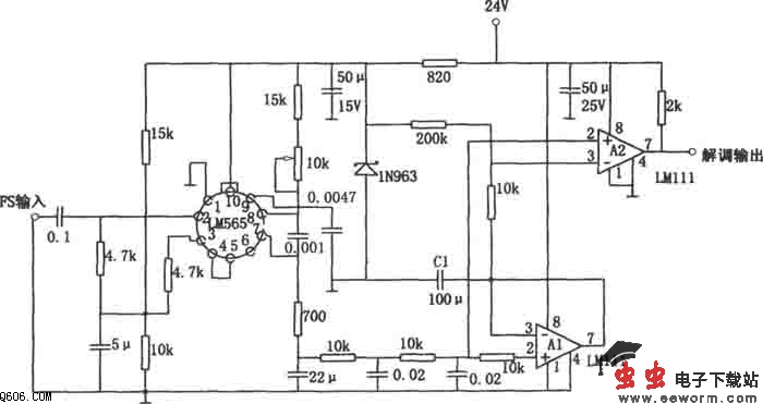 如图所示为灵敏的频率解调电路。该电路采用锁相集成电路LM565构成,能在很宽的频率范围内跟踪频率偏移。但是,对于频偏较小的信号,由于解调输出信号小,压控振荡器的漂移将会造成比较器工作点的漂移而产生误差。本电路为克服上述缺点,在电路上加有直流再生部分,因而对于频偏小的信号也能稳定工作。图中,LM565和比较器LM111构成的解调电路和一般的频率解调电路基本上是相同的。所不同的是,该电路中A2③脚输入信号不是从LM565⑥脚取出,而是从峰值保持电路A1取出。在调频输入信号的间隔内,A1的输出为低电平,于是保持电容C1通过A1的低输出阻抗放电,并保持信号峰值。采用这种直流再生的办法,尽管压控振荡器存在漂移,但峰值保持电路的输出可以跟踪,因此,比较器可以正常工作。