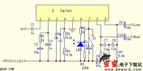 TA7343的供电电压为3.5--12v,具有制作元件少,不需外接分离度调节元件,仍能保持较高的声道分离度,一般为45dB。