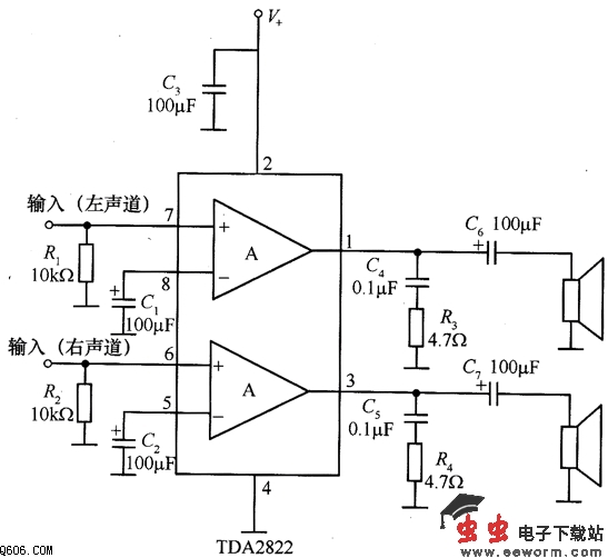 TDA2822是小功率集成功放,其特点是:工作电压低,低于1.8V时仍能正常工作,集成度高,外围元件少,音质好。TDA2822广泛应用于收音机、随身听、耳机放大器等小功率功放电路中。