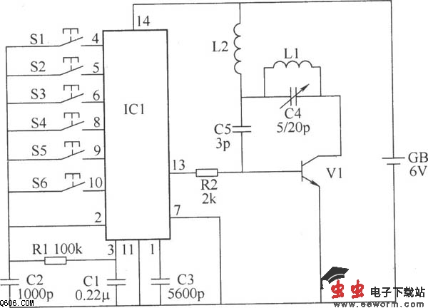 无线发射电路由编码集成电路IC1、控制按钮S1~S6、晶体管V1、电阻器R1、R2、电感器L1、L2、电容器C1~C5和电池GB组成,如图所示。