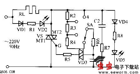 电路原理图如图1所示。调节波段开关SA的挡位,可以改变电容C1的充放电速率。利用C1两端交流电压通过双向触发二极管VD3去触发双向晶闸管VS导通、并改变了VS的导通角,使负载RL两端交流电压随之发生变化。