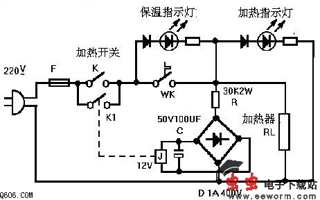 饮水机背后都有一个船形的加热开关K,具有加热、断开两个位置。当K打开 后电源通过熔断器F、温控器WK加至电热管RL两端,同时电源通过电阻R降压、 整流桥Q整流、电容C滤波后得到15V的直流电压,使继电器J动作,K1闭合。如果此时将加热开关断开,电热管仍然处于加热状态,直至加热罐内的水加热到设定的温度,温控器WK断开,继电器J失电,K1断开,电路退出自保持状态,以后不再进行加热。继电器应选用动作电流较小的为好,可以防止电阻R上的功耗过大。 如果要进一步提高节能效果,需要对饮水机的加热罐作一些小改造,大多数饮 水机的保温措施很简单,仅仅采用两片预成型的泡沫塑料将加热罐围住而已,所以散热很快。最好能用聚氨脂材料(一般制造太阳能热水器的厂家有)在加热罐四周进行现场发泡填充,这样处理可以使保温材料和加热罐之间没有间隙减少空气流动可以大大提高保温效果。