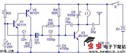 工作原理 电路如下图所示。光敏电阻RG、电阻R1构成分压器,可通过调节R1的阻值控制光敏电阻RG的灵敏度。光敏电阻见到光时阻值很小,三极管V1得到偏置电流导通,电容C1、V2产生自激多谐互补型振荡器,电阻R2模拟扬声器工作。电解电容器C2耦合到电阻R3、电容C3构成预加重网络,三极管V3、电容C5、C6、L1组成调频发射电路,产生88MHz~108MHz的频率,调节电容C6可改变发射机的频率,电感线圈L1直接印制在线路板上不会产生跑台,信号由电容C7通过天线发射出去,供使用者的调频接收机接收发出的报警信号。光敏电阻RG见不到光,阻值很大,三极管V1、V2得不到电流,接收机收不到信号,电路停止工作。发射部分电流在4mA左右。