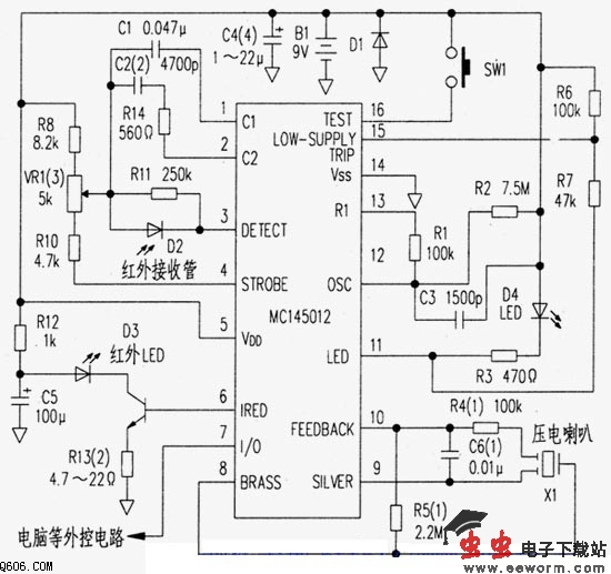 火灾报警器集成电路MC145012集成了报警器的全部功能,只要外接红外线发射、接收元件及喇叭等,就可构成一台火灾报警器,而且还可以与电脑连接构成报警系统。
