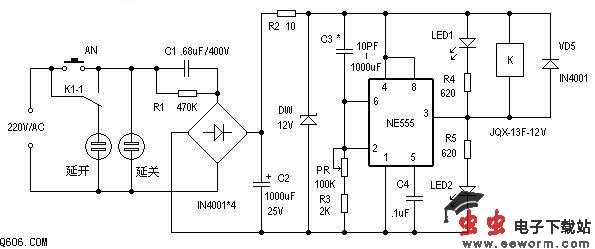 这时电源通过电容器C3 、电位器RP、电阻器R3至“地”,对C3进行充电,随着C3上的电压升高,NE555的②、⑥脚的电压越来越往下降,当此电压下降至2/3Vcc 时,NE555的③脚输出由低电平跳变为高电平,这时继电器将失电而不工作,则其控制触点恢复原位,则“延关”插座失电,而“延开”插座得电。就这样满足了不同的需求,LED、LED2作相应的指示。