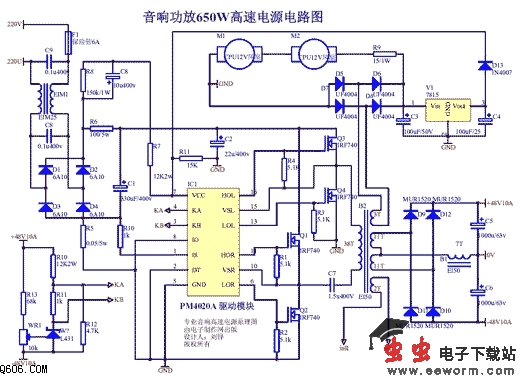 音响功放650W高速电源电路是用下面的PM4020A 作为驱动源制作的一款高级电子变压器,它有非常快的电流速度,是代替传统笨重工频变压器的新产品。用PM4020A 设计的电源基本不需要调试就会可靠工作。