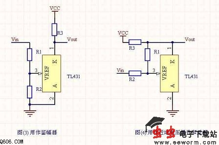 利用TL431还可以组成鉴幅器,如图(3),这个电路在输入电压 Vin < (R1+R2)*2.5/R2 的时候输出Vout为高电平,反之输出接近2V的电平。需要注意的是当Vin在(R1+R2)*2.5/R2附近以微小幅度波动的时候,电路会输出不稳定的值。
