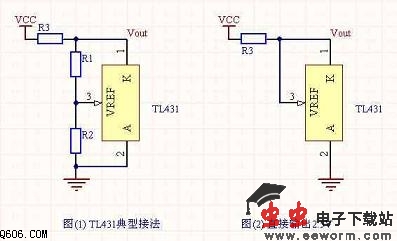 图(1)是TL431的典型接法,输出一个固定电压值,计算公式是: Vout = (R1+R2)*2.5/R2,