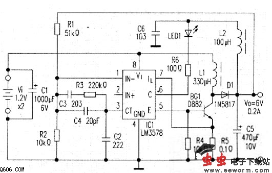 元器件选择:IC1型号为LM3578,双列直插,市场上有货。BG1型号D882,TO-126封装,选用β大于100的管子。L1市场有供应。若自制L1,取φ12mm高频磁环,用φ0.15色线穿绕约60T,可由电感仪测量一下约为330μH左右,另一个电感L2为色码电感,市场上很便宜。电容除了C6为磁片电容之外,其余的为CBB型,电阻无特殊要求。D1为升压二极管,采用肖特基二极管,型号为lN5817-5822均可,其正向压降VF=0.2V。