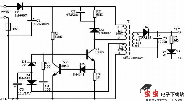市电经D1整流及C1滤波后得到约300V的直流电压加在变压器的①脚(L1的上端),同时此电压经R1给V1加上偏置后后使其微微导通,有电流流过L1,同时反馈线圈L2的上端(变压器的③脚)形成正电压,此电压经C4、R3反馈给V1,使其更导通,乃至饱和,最后随反馈电流的减小,V1迅速退出饱和并截止,如此循环形成振荡,在次级线圈L3上感应出所需的输出电压。L2是反馈线圈,同时也与D4、D3、C3一起组成稳压电路。当线圈L3经D6整流后在C5上的电压升高后,同时也表现为L2经D4整流后在C3负极上的电压更低,当低至约为稳压管D3(9V)的稳压值时D3导通,使V1有基极短路到地,关断V1,最终使输出电压降低。电路中R4、D5、V2组成过流保护电路。当某些原因引起V1的工作电流大太时,R4上产生的电压互感器经D5加至V2基极,V2导通,V1基极电压下降,使V1电流减小。D3的稳压值理论为9V+0.5~0.7V,在实际应用时,若要改变输出电压,只要更换不同稳压值的D3即可,稳压值越小,输出电压越低,反之则越高。