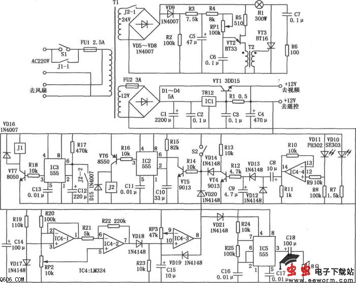 在液晶投影机的设计中,卤素灯的温度是危及液晶屏使用寿命的主要因素。用本电路制作的多功能控制器,对液晶投影机实施的保护十分有效。液晶投影机多功能控制器电路如图所示。由VD1~VD4、ICl、C1、VTl等元件组成整流、滤波、稳压、扩流电路,为全机供电提供保证。由VD5 VD8、C5、VT2、VT3等元件组成灯泡软启动电路。在通电瞬间,电源通过电阻R3向电容C5充电,由于C5两端电压不能突变,电压较低,使C6充电电流较小,故由VT2等元件组成的张弛振荡器停振,VT3不导通,灯泡不亮。随着C5两端电压的升高,通过R4、RPl对C6的充电电流增大,振荡器VT2起振且触发VT3导通的脉冲逐渐前移,灯泡被逐渐点亮,从而限制开机瞬间浪涌电流给灯丝造成的冲击。