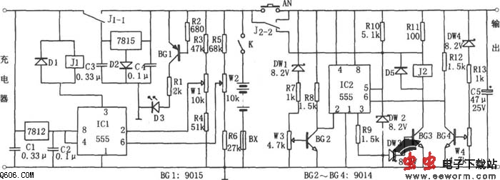 充电保护电路主要由IC1(555)、7812、7815等组成。其中7812供给IC1稳定的 12V电压。刚充电时,触点J1-1闭合,对蓄电池进行充电。当充至 15V时,IC1因②、⑥脚为高电平而发生复位,③脚输出的低电平使J1吸合,蓄电池通过断开触点J1-1、7815进行放电。当蓄电池端电压随放电降低且降至13.2V时,IC1因②脚电位低于l/3VDD=4V而发生置位,③脚输出的高电平使J1释放,电池又通过闭合触点J1-1充电。