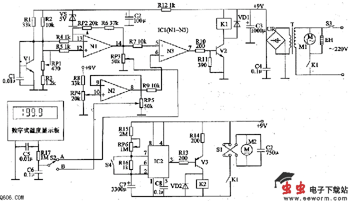 数字式温度显示板用来显示孵化箱内的温度和设定温度。将温度显示转换开关S2置于A位置时,用来显示孵化箱内的温度;将温度显示转换开关S2置于B位置时,用来显示设定的控制温度。