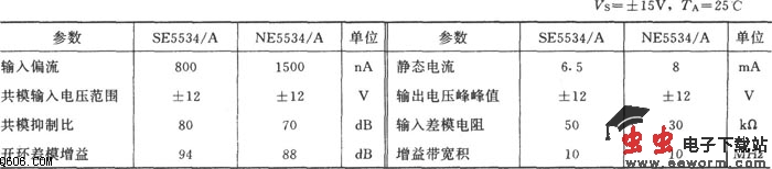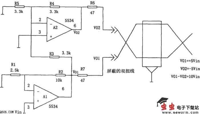 如图所示为差动负载缓冲器电路。输入信号Vin加到NE5534(或RC5534、SE5534、RM5534等)的同相输入端(引脚3),并在A1的输出端(引脚6)与反相输入端(引脚2)之间外接10kΩ的电阻R2,在反相输入端与地之间接2.5kΩ的电阻R1,即R2和R1引入电压串联负反馈,因而A1放大级的电压放大倍数为5,并经47Ω电阻和屏蔽双扭线将同相输出信号Vo1=5Vin加到负载的一端。同时A1的输出电压信号Vo1经3.3kΩ的电阻R3加到A2的反相输入端。由图(a)可知,A2接成A1的倒相电路,其结果是在A2的输出端得到的输出电压Vo1与Vo2大小相等但相位相反。该电压(Vo1)同样经过47Ω电阻R6和屏蔽双扭线中的另一根加到负载的一端,因而在负载两端的电压为Vo=Vo1-Vo2=10Vin。当A1、A2为5534型运放时,能在差动连接的300Ω负载上得到±7V的电压,或在1kΩ差动负载上可得到±20V的电压。
