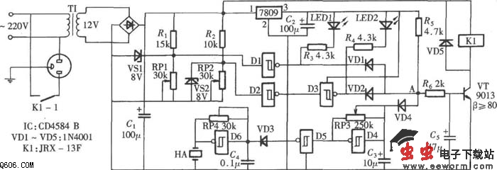 如图所示过欠电压保护电路由一片“六施密特触发器CD4584”组成,当发生市电电压过电压或欠电压时,一方面发出警笛声,同时通过继电器切断被控电路的工作电源。