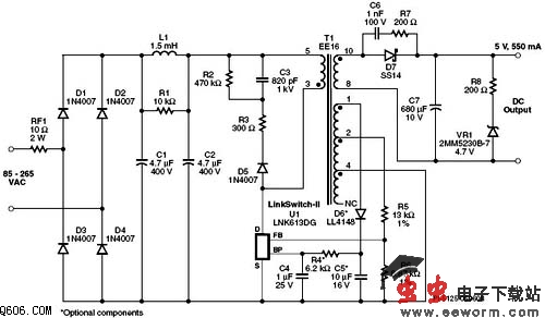在电路中,二极管D1至 D4对AC输入进行整流,电容C1和C2对DC进行滤波。L1、C1和C2组成一个π型滤波器,对差模传导EMI噪声进行衰减。这些与Power Integrations的变压器E-sheild?技术相结合,使本设计能以充足的裕量轻松满足EN55022 B级传导EMI要求,且无需Y电容。防火、可熔、绕线式电阻RF1提供严重故障保护,并可限制启动期间产生的浪涌电流。