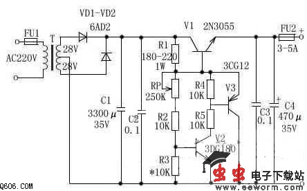 元器件选择:变压器T选用80W~100W,输入AC220V,输出双绕组AC28V。FU1选用1A,FU2选用3A~5A。VD1、VD2选用6A02。RP选用1W左右普通电位器,阻值为250K~330K,C1选用3300µF/35V电解电容,C2、C3选用0.1µF独石电容,C4选用470µF/35V电解电容。R1选用180~220Ω/0.1W~1W,R2、R4、R5选用10KΩ、1/8W。V1选用2N3055,V2选用3DG180或2SC3953,V3选用3CG12或3CG80。