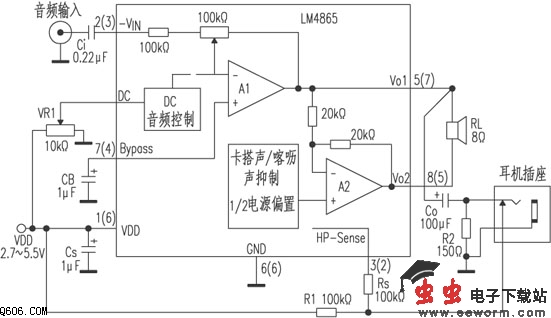 在LM4065的V01脚与地之间通过电容C0连接耳机。只要施加于IC脚HP-Sense上的电压超过4V的门限,放大器A2被关断,扬声器无声。当耳机没有插入耳机插座时,脚HP-Sense上的电压由R1和R2组成的电阻分压器设定,使LM4065在桥接负载模式下操作。当耳机插头插入插座之后,A2被关断。因此,耳机起开关作用。