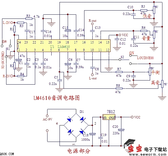 LM4610是美国NS公司继LM1036后推出的一款新型的高档HIFI级的音调集成电路,是LM1036的理想替代产品,它也是利用直流电压来调节两个声道音量,高音,低音,平衡。该IC还在LM1036的基础上增加3D声场展宽调节,它还带有一个等响度开关,用以补偿在小音量时的人耳特性曲线。
