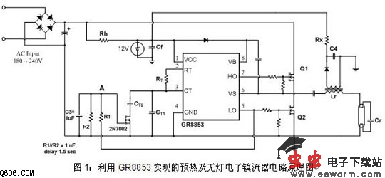 图1是用GR8853实现的预热及无灯电子镇流器电路原理图。该电路的振荡频率由式(1)确定。
