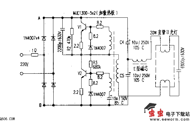此镇流器是用两只高速开关三极管MJE13005制作的20W日光灯电子镇流器。