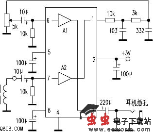 用TDA2822制作音频感应无线耳机有多人制作过, 发现对TDA2822均没能合理利用!此芯片为双声道音频放大器, 而许多制作均只利用了 其中一个声道, 另一声道闲置;或者做成BTL形式!以上方法虽可行, 但从应用上讲没达到最佳效果!此类耳机音源为一多圈磁心线圈, 其频响特性类似于录音机磁头, 所以应按照riaa(美国录音工业协会)均衡网络进行频率校正, 使其频率响应尽可能平坦!改进后得 电路如下图!感应信号首先进入一个声道放大, 输出端经过一个衰减网络进行频率校正, 最后经电位器馈入另一声道进行功率放大!经此改进后听音, 首先市灵敏度增加, 有益于掩盖功放得 本底噪声;同时声音变得柔和耐听!这对学校进行语言教学非常有利, 过高得 高频会使人声中唇齿音太明显而影响听音效果!