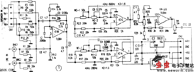 4个运算放大器IClB、IClA、IClC和IClD分别承担输入放大、窄频带滤波调节、宽频带滤波调节和倒相音量调节的功能。IClB输入放大电路对声源的LINE双声道线路输出和SPEAKER双声道扬声器功率输出分别在相叠加后进行同相放大和共模差分同相放大。扬声器输入端的电路结构不仅适合OCL功放输出,还适用于无接地端子的BTL功放输出。R16、C2和R15组合的反馈网络,使放大电路具有一阶低通滤波特性。IClA和IClC分别构成的是二个转折频率可调的塞伦·凯二阶低通滤波电路,调节W1、W2可方便地改变低通转折频率。最大的特点是可以设置一个并不随转折频率的调节而变化的固定的等效品质因数Q。可通过调整R20、R21和R25、R126间的阻值关系来进行设定。