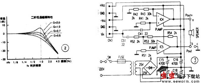 期望让重低音箱的低通特性能弥补其它声道音箱低频段的高通特性以求达到整体频响曲线平坦时,电路中的Q值应该设定在0.707左右(见图2)。本电路中的2个二阶滤波电路的Q值均为0.714,更接近于理想的滤波特性,并具有1.6倍的放大倍数。协调IC1A和IC1C电路的转折频率,以错落或同频等不同的叠加形式,可实现幅频特性向频率低端呈二阶至四阶的提升。当IC1C的转折频率调升到低频段外即200Hz之上至最大600Hz间时,在低频段内只有IC1A在发挥滤波作用、使整个电路呈二阶低通特性 。