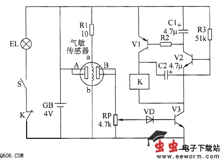 在气敏传感器未检测到瓦斯气体时,其A、B之间呈高阻状态,VD和V3处于截止状态,K不动作,矿灯工作在照明状态。