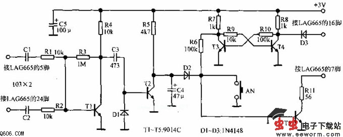 T1为信号放大,T2为节目间隙检出,T3、T4为双稳电路和控制电路,T5为静音。LAG665的7脚为直流音量控制。T5导通,输出截止静音。16脚为马达速度控制,当T4导通时转速加快,通常状态时T3导通,T4、T5截止,这时按下放音键处于正常放音状态。当按下AN时,双稳电路翻转,T3截止,T4、T5导通,16脚为低,马达快速转动,7脚为低,耳机静音。前置的音频信号从5,24脚输出经T1放在,D1、T2检波使C4两端变为低电平,电路处于快速选曲状态,经过节目间隙时,前置无信号输出,C4被充至高电平,双稳电路再次翻转变为正常状态,从而实现自动选曲。