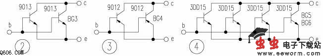 本电路中元器件均为易购的常用元器件,按图中所示数值选用即可。B1用收音机输出变压器,应选用铁心大,线径粗的那一类,把原来接喇叭的这一组线圈接在L2位置,BG3、BG4分别用两只9013和9012并联组成,如图2和图3所示。BG5、 BG6均由四只3DD15并联组成,如图4所示。BG5、 BG6的散热器面积不应小于600cm2,B2逆变变压器可选用成品。整机用印刷线路板可自行设计制作。电瓶选用容量大于150Ah的电瓶。