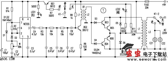 电路见图1。当把开关K1打向“逆变”位置时,BG1导通,由时基电路NE555及外围元件组成的无稳态多谐振荡器开始振荡,其充、放电时间常数可调节。如果选择R1=R2,则输出脉冲的占空比为50%,该多谐振荡器的振荡频率f=1.443/(R1+R2+2W)C2,图中的元件数值可使振荡频率调在50Hz,振荡脉冲由役脚输出,波形为方波,该方波经C4耦合,R3、C5积分变为三角波,这个三角波又经R4、C6,第二次积分和R5、C7第三次积分,变为近似的正弦波,通过C8耦合到BG2,由BG2放大后在B1的L2线圈上输出。当L2上端电压为正时,D4截止,D3导通,使BG4、BG6截止,BG3、BG5导通,电流由电瓶正极→B2的L1→BG5→电瓶负极;当L2上端电压为负时,D3截止,D4导通,使BG3、BG5截止,BG4、BG6导通,电流由电瓶正极→B2的L2→BG6→电瓶负极。BG5、BG6交替导通、截止,经变压器B2合成正负对称的正弦波,并由L3升压送至逆变输出插座CZ1、CZ2,供用电器使用,同时LED1(红色)亮,指示逆变状态。