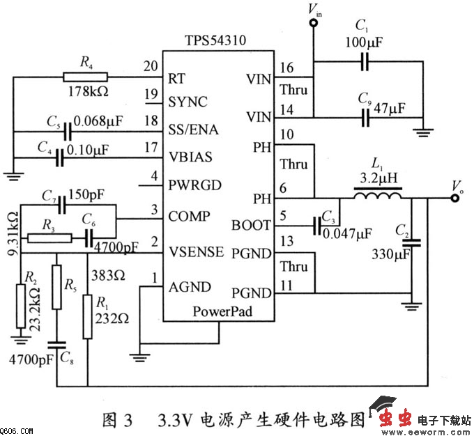 参考SWIFT De signer软件,设计了基于TPS54310的TMS3320DM64xX SOC的三种电源电路,以3.3V I/O电源电路为例(参见图3),其主要步骤如下。