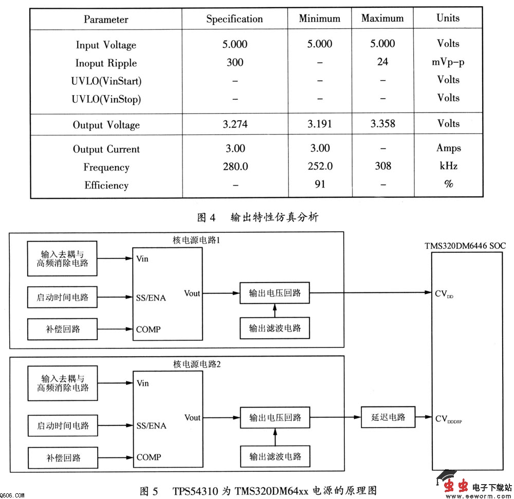 以高性能DC/DC调节器TPS54310为核心设计的TMS320DM64xx SOC电源电路,能够提供稳定精准的核电压和I/O电压,外部附加简单的延时电路可以保证正确的上电时序,能够为SOC系统建立可靠的电源电路,正确实现SOC系统的功能.