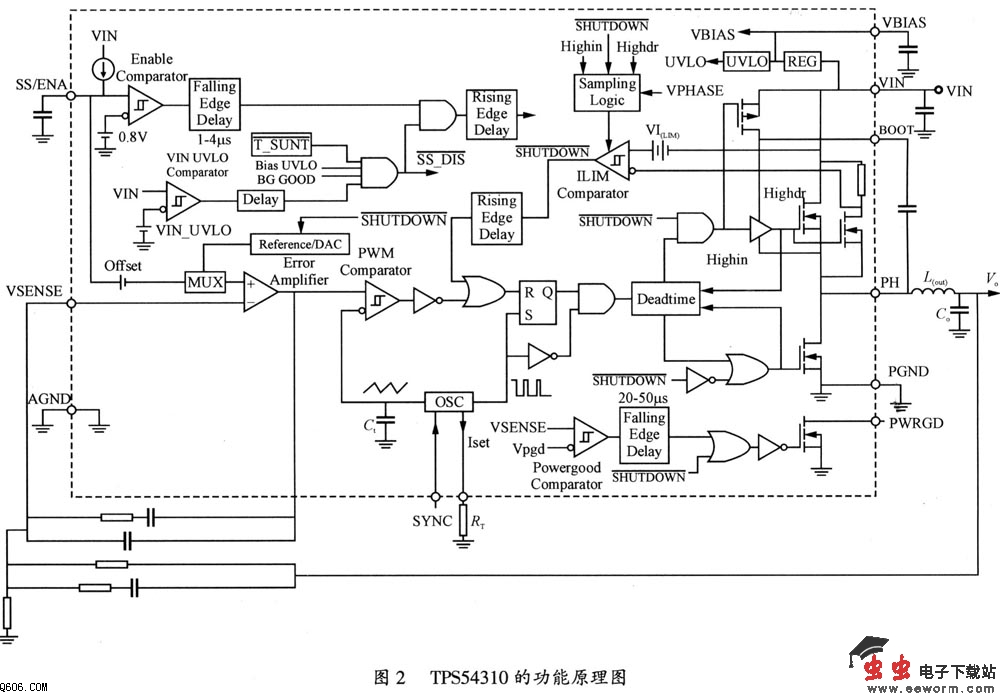 TPS54310是一款开关电源调节器,其功能原理图如图2所示,能够实现低电压输入和高电流输出(输入电压范围为3~6V,输出电压在0.9~3.3V之间可调,输出电流为3A);内部具有电压误差放大器,能够提高瞬态响应条件下的工作性能;可以分别从内部或外部设置慢启动方式;其良好的电源输出特性可用于处理器/逻辑复位、故障信号检测和连续电源。