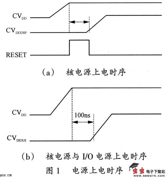 图1(a)、图1(b)分别显示的是内核电源之间以及内核电源与I/0电源之间的上电时序。内核电源的上电时序依赖复位时选择的DSP启动模式:如果DSP初始化模式被配置为自启动模式,要求两个内核电源同时上电;如果DSP被配置为主机启动模式(即ARM启动DSP),要求两个内核电源分别上电,CVIDD优先于CVDDDSP,而CVDDDSP必须在复位信号开启(关闭)之前上电。如图1(b)所示,I/O电源必须在CVDD电源上电后的100ns内上电,各个I/O电源的上电顺序没有要求。