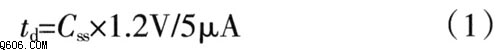 通过在SS/ENA(慢启动/芯片使能)管脚和AGND(模拟地)管脚之间加一个小电容(Css)能够达到延长启动时间的目的,延迟时间的计算公式为