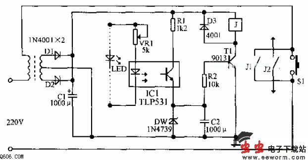 MP3自动断电电路如下图所示,将MP3音频输出线引出,用光点耦合器IC1中的光电管接音频线。有声音出现时,取代后的光电管发光,使光电三级管的阻值减小,输出的高电平经DW稳压后向T1的发射结提供正向导通电压,使T1导通,继电器吸合。电容C2的缓慢放电过程提供一种延时功能,改变C2的大小可改变延时的长短。