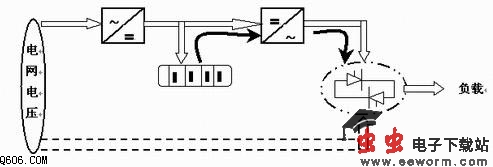 如图1所示,在电网电压工作正常时,给负载供电如所示,而且,同时给储能电池充电;当突发停电时,UPS电源开始工作,由储能电池工给负载所需电源,维持正常的生产(如粗黑→所示);当由于生产需要,负载严重过载时,由电网电压经整流直接给负载供电(如虚线所示)。