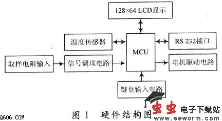 MCU采用Atreel公司的高速嵌入式单片机AT-mega128,它采用先进的RISC精简指令集结构,具有128 KB的在线可重复编程的FLASH、4 KB的SRAM和4 KB的E2PROM,同时具有8/16位定时器/计数器、PWM输出模块、UART、SPI等多种串行通信接口、可编程的看门狗定时器等功能模块、丰富的外部和内部中断源、多种工作模式。这些特性使ATmega128成为功能更强大的微控制器,更好地支持应用于脉宽调制、高速I/O、递增/递减计数能力等工业控制等场合。在程序中主要完成水分的采样和高速处理、LCD显示、键盘输人、驱动输出、与PC机进行通信等工作。该测定仪的测量的范围在5~30%之间,精度在±0.2%,水分用2个字节表示,因此共需要1 KB保存在某一温度条件下的水分值,再加上温度补偿系数和密码的设定。4 KB空间已经足够了。它的可编程的看门狗定时器模块能保证系统能够可靠稳定的工作。