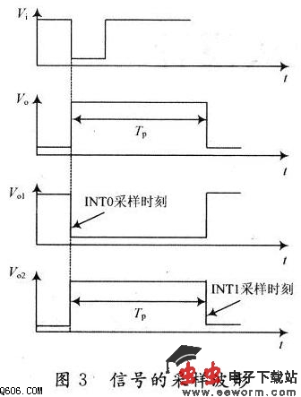 电子开关和触发信号都由单片机控制。脉宽的测量由单片机的外中断和定时中断来完成,由于单片机的外部中断INT0和INT1均为负跳沿触发中断,因此在555的输出端加一级反相器,INT0中断采样输出信号的上跳沿,然后再经过一级反相器,INT1采样输出信号的下跳沿。两者采样的时间差就是脉冲宽度。时间差的计算可由单片机的定时中断来实现,在INT0的中断程序里开启定时中断,在INT1的中断程序里关闭定时中断。信号的采样波形如图3所示。