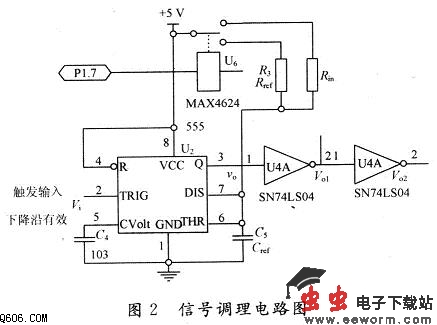 单片机通过RS 232串行通信接口实现与PC机的通信,把测量数据上传至计算机中,以进行进一步的数据处理,同时也可进行远程操作,实现在线测量。信号调理电路采用555芯片构成的非重复触发的单稳触发电路,为提高响应速度,555芯片采用CMOS工艺的7555型号。具体的信号调理电路如图2所示。