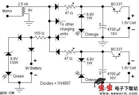 一个2.5V 的变压器可同时充电4 颗电池,虽然在图表上只显示了2 颗。为了将电路与电路之间的干扰减到最低,它们除了变压器相同之外其它都不同,为了让变压器的负载平衡,一半的充电元件会采用正正弦波,而另一半采用负正弦波。请使用高频共射极电流增益晶体管,例如BC337-25 或者更好的BC337-40。有时晶体管的散射参数有可能使得它无法发生振荡。用一个微弱的高频齐纳电压:7.5V 代替6.8V 或者一个绿色的LED 代替橙色的LED。