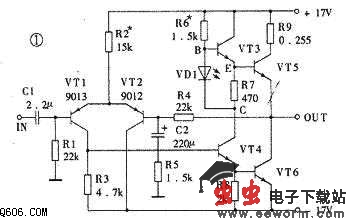 由VT1、 VT2组成差动放大电路,每管静态电流约为0.5mA。R3为VT1的集电极负载电阻,VT1与推动级VT4之间为直接耦合。输出级由两只型号相同的 NPN型大功率晶体管VT5、VT6组成,而没有采用互补对称推挽电路。输出管VT6对于负载(扬声器)来说是共发射极电路,而VT5则是射极输出电路,因此是不对称放大。但实验测试表明,整个放大电路在取消大环负反馈(将R5短路)时的开环失真却很小,而且主要是偶次谐波失真。这个功劳应该归功于推动级电路。推动电路是本机最具特色的电路,它的作用和效果与传统的RC自举电路相比,有过之而无不及。VT4为集-射分割式倒相电路,分别由其集电极和发射极输出一对大小相等、方向相反的信号。VT4对于输出管VT6来说为射极输出电路,电压放大倍数小于1。从VT4集电极输出的信号通过交流电阻很小的发光二极管VD1,加到输出推动管VT3的基极。VD1的正向导通压降约为1.9V左右,可看作一个噪声很小的稳压二极管,它使得VT3的发射极电阻R7两端的直流电压UEC基本不变,约比VD1的稳压值小0.7V。对交流信号而言,R7是与VT3的发射结电阻相并联的。VT3和VT5组成同极性达林顿式复合管。因此推挽放大的上臂是由一级共射放大电路(VT4)和二级射极输出电路(VT3、VT5)构成的,而推挽电路的下臂是则由一级射极输出电路(VT4)和一级共射放大电路(VT6)构成,可见是不对称的推挽放大电路。故在选择放大管时,这几只管子的电流放大系数也不必配对。这一点在工厂大批量生产时尤为重要,可以大大降低成本。