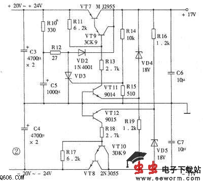 由于功放为OCL电路,输出端与扬声器直接耦合,故一般应加装延时保护电路,但由于该机采用了具有短路保护及软启动功能的±17V双路稳压电源,故省略了这部分电路。正负稳压电路均采用集电极输出式调整电路,效率高且具有短路保护功能,但不能够自启动。VT7、VT9组成复合电源调整管。VT11为取样放大管。由于VT11的基极接地,故发射极电位必须为-0.7V才能使它工作于放大状态。所以R19的下端不能接地,而是接至-17V。所以,如果万一负输出电源对地短路,将会使 VT11的发射极与基极间的电压为零,从而使VT11截止,这样调整管VT9、VT7因得不到基极电流也截止,结果使得正输出电源电压为零。由于正、负稳压电路是对称的,故当正电源对地短路时,也会使负电源电压为零。功放电路的输出端省却了扬声器保护电路的原因也在于此,万一有一只输出管发生击穿短路,另一只输出管也会由于上述保护功能而得不到电源电压,这样扬声器中就不会有大的直流电流通过,从而有效地保护了扬声器。[!--empirenews.page--]