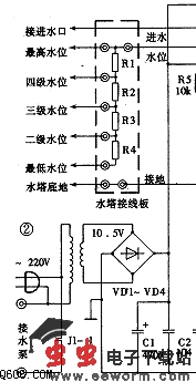 Q606型水位显示控制器具有更完善的功能,下图是其电原理图。它用发光二极管将水塔存水量分五级显示在控制器上,并在自动控制泵水的基础上,增设了自停启动、手停启动和停泵按钮。自停启动可随时开泵,水满自停,且有报警保护锁定状态复位功能。手停启动按钮无自停功能,专为其它用途泵水(不是给水塔上水)时使用,开后应注意人工停泵。 字串3IC1为四运算放大器,它与VT1组成一至五级水位显示电路。正电源经R5、C3滤波后,一路由R6~R10分压,作IC1各级输入的基准电压,另一路接入水塔底地电极,通过水接各级水位电极,与R1~R4构成不同串并后,再与R13、R14分压,得到代表不同水位的电压信号加到IC1各级的另一输入端,它与各基准电压比较后,输出第二至第五级的水位指示,第一级水位指示由VT1输出。LED1~LED5分别指示第一至第五级水位。IC2为施密特触发器。IC2a作进水放大,LED6为进水指示。IC2b组成延时保护,延时时间由R25和C9调定,应略大于开泵至水塔有进水所需的时间。IC2c与IC2d组成双稳态电路,它具有自动控制与保护功能。输入由四路控制:①当水位低于第一级电极时,VT1集电极为正,通过R20、VD7使双稳处于开泵状态,实现水位低自动开泵。②按自停启动钮K1,双稳处于开泵状态。③IC2b输出为负时,双稳处于关泵状态。即水位至第五级以上时,IC1d输出为正,通过VD6作用于IC2b,实现水满自停;或当泵无水,且到达延时时间后,IC2b输出变负,实现泵无水自停。④按停泵钮K3,双稳处于关泵状态。LC2e和IC2f组成手控双稳电路,由手停启动钮K2开泵,K3关泵,相当于普通开关。二级双稳并联控制VT2,通过继电器开关水泵。LED7与LED8分别为自停启动和手停启动的指示灯。